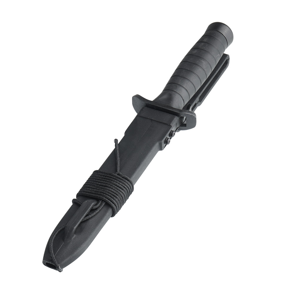 Die Scheide ist aus hochschlagfestem Kunststoff in schwarzer Farbe gefertigt. Sie hat zwei Ösen zur Befestigung von bis zu 32 mm oder 60 mm breiten Gürteln und zwei Löcher für Paracord oder Tape an der Unterseite. Das Messer wird durch einen Federverschluss, der durch das Loch im Handschutz geht, in die Scheide gesteckt.