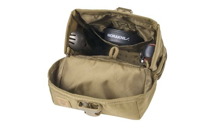 Die E&E Pouch basiert auf einem modifizierten Design von Taschen der britischen Spezialeinheiten. Sie dient zum Tragen einer Vielzahl von Survival- und Bushcraft-Ausrüstung wie Feldflasche oder Ration. Sie ist für die Befestigung an einem Gürtel oder MOLLE/PALS-System angepasst.