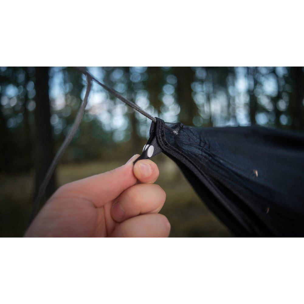 Die Konstruktion des Moskitonetzes ist selbsttragend, so dass keine zusätzlichen Leinen oder Rahmen verwendet werden müssen, die das Gewicht des Moskitonetzes erhöhen würden. Wenn der Vorhang auf den Boden fällt, sammelt er dank seines dichten Gewebes keine unnötigen Abfälle an. Zur Versteifung des aufgehängten Moskitonetzes kann der Benutzer bei Bedarf eine Schnur wie z. B. SMUK verwenden, dies ist jedoch nicht erforderlich.