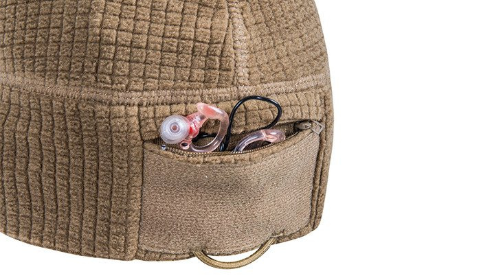 An der Vorder- und Rückseite sowie an der Oberseite der Mütze befinden sich Klettverschlüsse zum einfachen Anbringen von Abzeichen oder Aufnähern. Auf der Rückseite befindet sich eine kleine YKK-Reißverschlusstasche, in der kleine Gegenstände wie Ersatzohrstöpsel aufbewahrt werden können. Mit der praktischen Kordelschlaufe lässt sich die Mütze bequem an einem Karabiner befestigen.