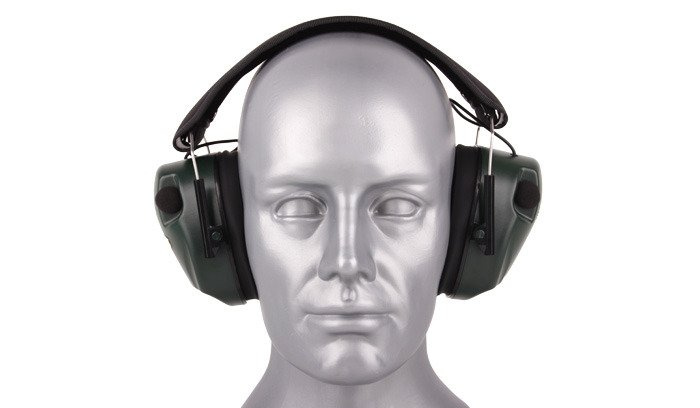 Ein elektronischer Gehörschützer mit klassischem Design, ausgestattet mit zwei Mikrofonen, die den Stereo-Empfang der Umgebung zu erhalten.
