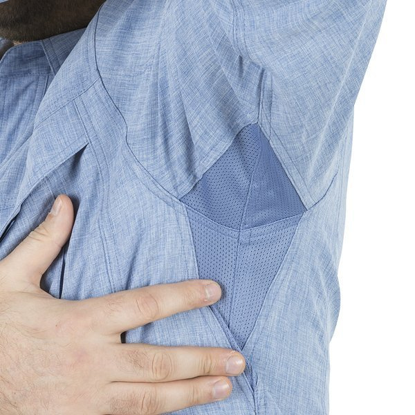 Das Material hat gute feuchtigkeitsableitende Eigenschaften und der UPF 30 reduziert das Eindringen von UV-Strahlen. Im Brustbereich befinden sich vier Taschen : zwei aufgesetzte Taschen mit Klettverschluss und zwei flache Taschen, die mit YKK®-Reißverschlüssen geschlossen werden und sich unterhalb der Klappen befinden. Unter den Achseln befinden sich Belüftungseinsätze, um den Luftaustausch in Bereichen mit höheren Temperaturen zu verbessern. Der Schnitt mit einer konturierten Schulterlinie erleichtert die Bewegungsfreiheit, und die Bündchen sind im Umfang verstellbar. Am Saum befindet sich eine Schlaufe zum einfachen Aufhängen der Brille. Als Verschlusselemente dienen Knöpfe mit dezenter Herstellerkennzeichnung.
