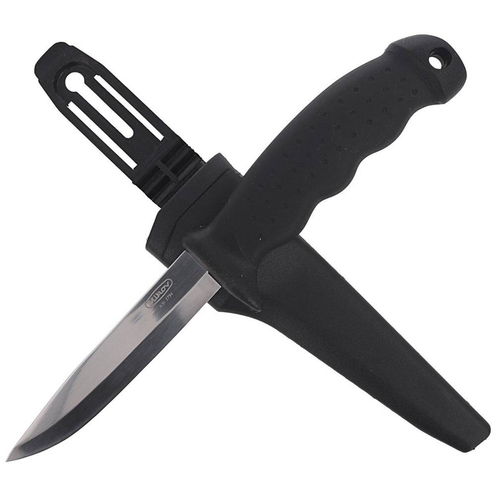 Der feuchtigkeitsbeständige, schwarze Griff aus gehärtetem Kunststoff mit rutschfestem Muster sorgt für einen angenehmen, sicheren Halt. Trotz seiner relativ geringen Größe liegt das Messer auch in großen Händen gut. Die runde Form des Kopfes verhindert ein Abrutschen der Hände während der Arbeit.