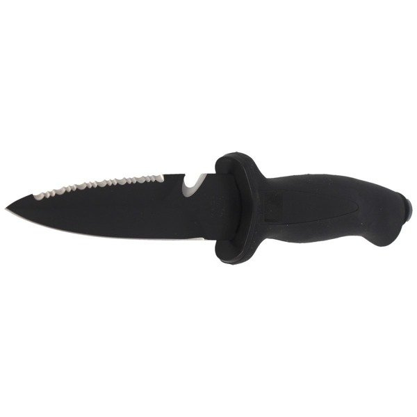 AQUATYS STILETTO 2, ein Full-Tang-Tauchmesser mit einer Klinge, die mit einer schwarzen, matten Beschichtung versehen ist. Produziert von der italienischen Firma MAC Coltellerie. Ein ideales Werkzeug für den Einsatz bei Tauchausflügen und Aktivitäten an Land.