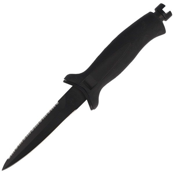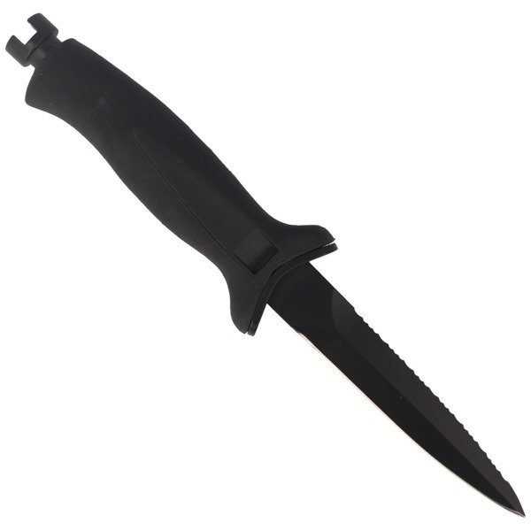 AQUATYS 11 2, ein Vollerl-Tauchermesser mit einer Klinge, die mit einer schwarzen, matten Beschichtung überzogen ist. Produziert von der italienischen Firma MAC Coltellerie. Ein ideales Werkzeug für den Einsatz bei Tauchausflügen, Unterwasserjagd und Aktivitäten an Land.