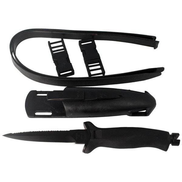 Gehäuse - aus ABS-Kunststoff mit Löchern zum Ablassen von Wasser, Feuchtigkeit. Das Holster ist mit einem Riegel mit Blockade ausgestattet, der ein Herausrutschen des Messers im Wasser verhindert. Zwei Gummiriemen und 2 Kunststoffschnallen zum Befestigen des Etuis an der Hand, am Bein oder an der Weste.