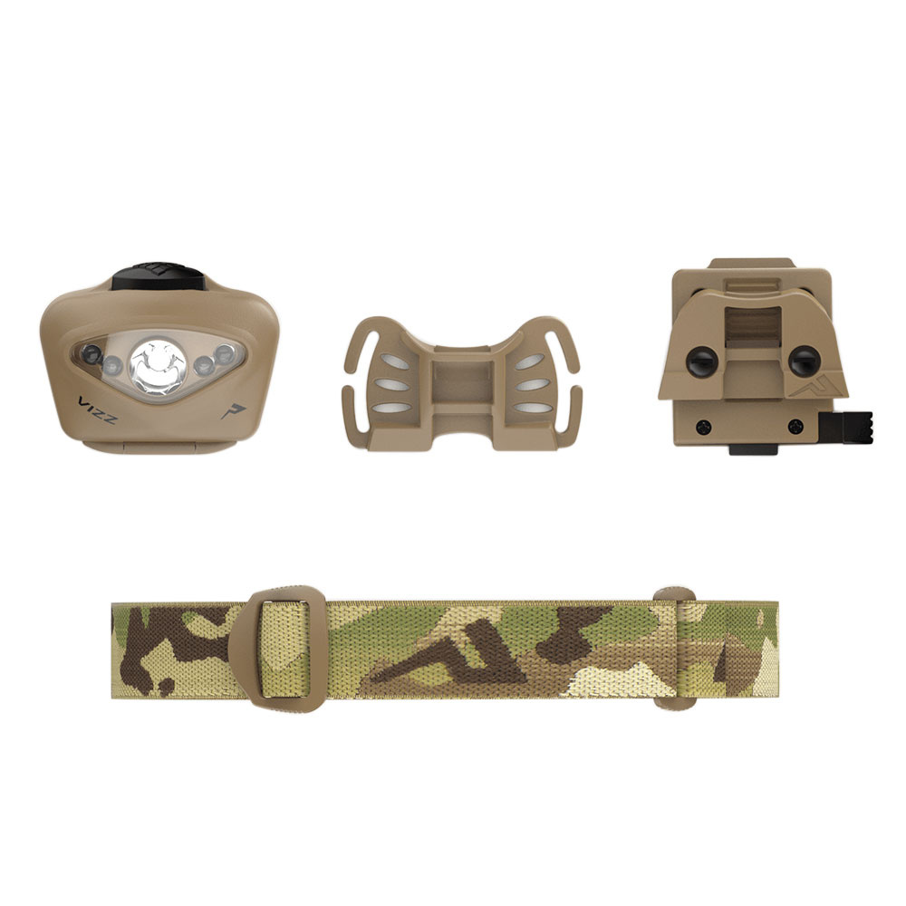 VIZZ TACTICAL Modular Personal Lighting System ermöglicht es Ihnen, die Taschenlampe auf vier Arten zu tragen: montiert an einem Helm mit OPS-Core VAS Halterung, montiert an einem Helm mit MICH NVG Halterung, am Kopf oder Helm mit einem flexiblen Band und befestigt an einem MOLLE/PALS konformen horizontalen Band oder Rucksack.
