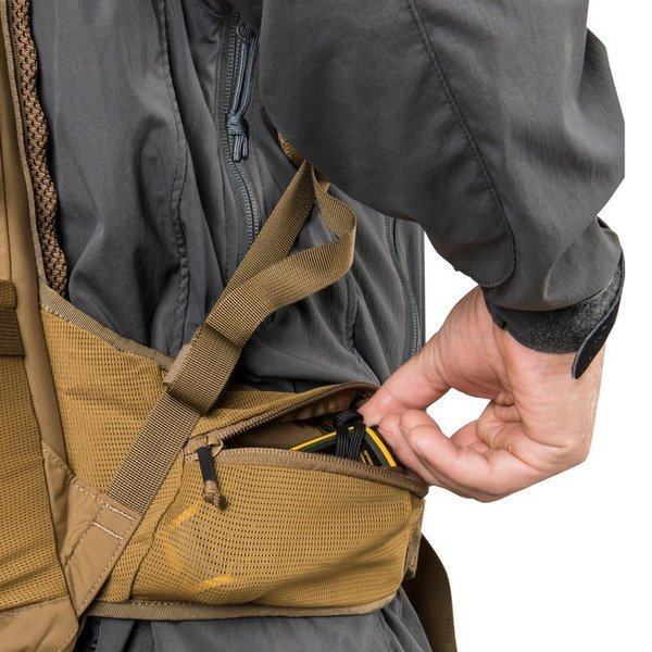 Auch am Hüftgurt befinden sich kleine Taschen mit Reißverschluss. Der Hüftgurt selbst ist für mehr Komfort profiliert und wird mit WooJin-Schnallen geschlossen. An den Seiten des Rucksacks befinden sich 10 mm breite MOLLE-Lite-Bänder, die es Ihnen ermöglichen, zusätzliche Elemente wie Taschen oder Behälter des MOLLE/PALS-Standards anzubringen.