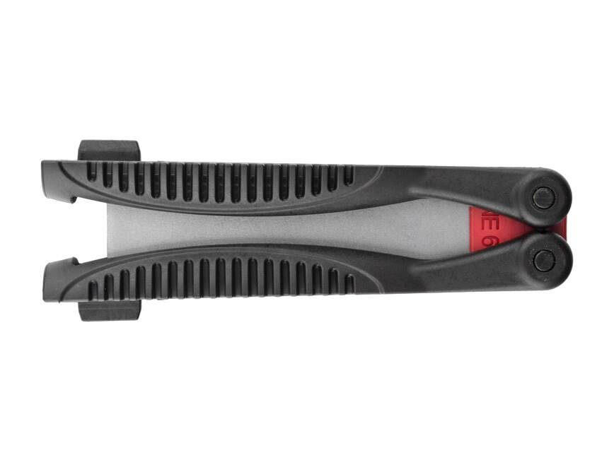 Das Schärfgerät hat eine zweistufige Abstufung. Die erste, grobe 120er-Stufe eignet sich gut zum Schärfen der Arbeitskante und zum Ausbessern der Kante von stumpfen Werkzeugen. Die zweite feine 600 wird helfen, schärfen ein Messer schnell. Dank seines Designs und der Möglichkeit, ihn zusammenzuklappen, eignet er sich ideal als Ausrüstungsgegenstand, z. B. auf einem Camping- oder Jagdausflug.