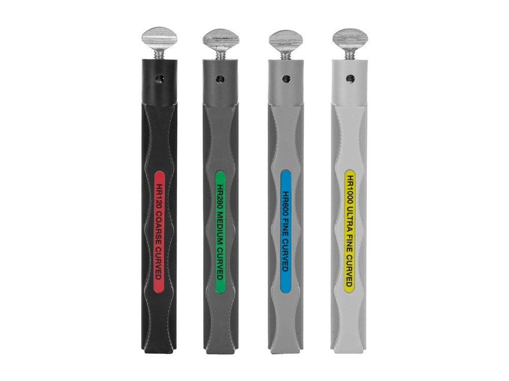 Vierer-Set Curved Blade Hones HRSET 4 Stück Schärfsteine für gebogene Messer von Lansky. Die Steine sind so konzipiert, dass sie dem Benutzer das Schärfen von Werkzeugen mit nach innen gebogener Klinge, wie Kukri-Messer, Karambit-Messer, Hawkbill-Messer und Sensen, so einfach wie möglich machen. Hinzu kommt die ergonomische Form der Steine, die in Kunststoffgehäusen untergebracht sind. Das Set enthält 4 Steine der folgenden Abstufung: