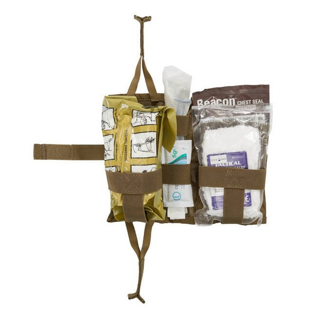 Der Einsatz ist - ebenfalls beidseitig - mit einem rutschfesten Griff ausgestattet, der es ermöglicht, den Inhalt des Verbandskastens mit einem schnellen Zug zu entnehmen. Flexible Schlaufen in verschiedenen Größen halten und sichern die Ausrüstung sicher.