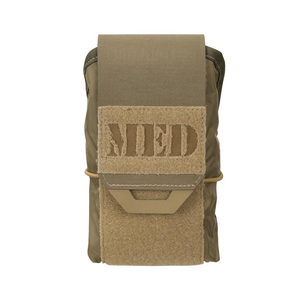 Das Design des Med Pouch Horizontal besteht aus zwei Teilen, einem an der Ausrüstung befestigten Griff und einem Einsatz - einer medizinischen Tasche mit faltbaren Wänden und mit einem Griff für seine sofortige Extraktion. Das Ganze zeichnet sich durch einen leichten Zugriff auf den Einsatz aus, unabhängig von der verwendeten Hand, die Verlängerung erfolgt dank des Griffs aus Hypalon™-Material, der sich unter der Klettverschlusslasche befindet. Das Innere der Tasche wurde so gestaltet, dass es viele Gegenstände aufnehmen kann, die es wert sind, in einem Erste-Hilfe-Kasten mitgeführt zu werden. Die Installation der Ausrüstung erfolgt mit Gummibändern.