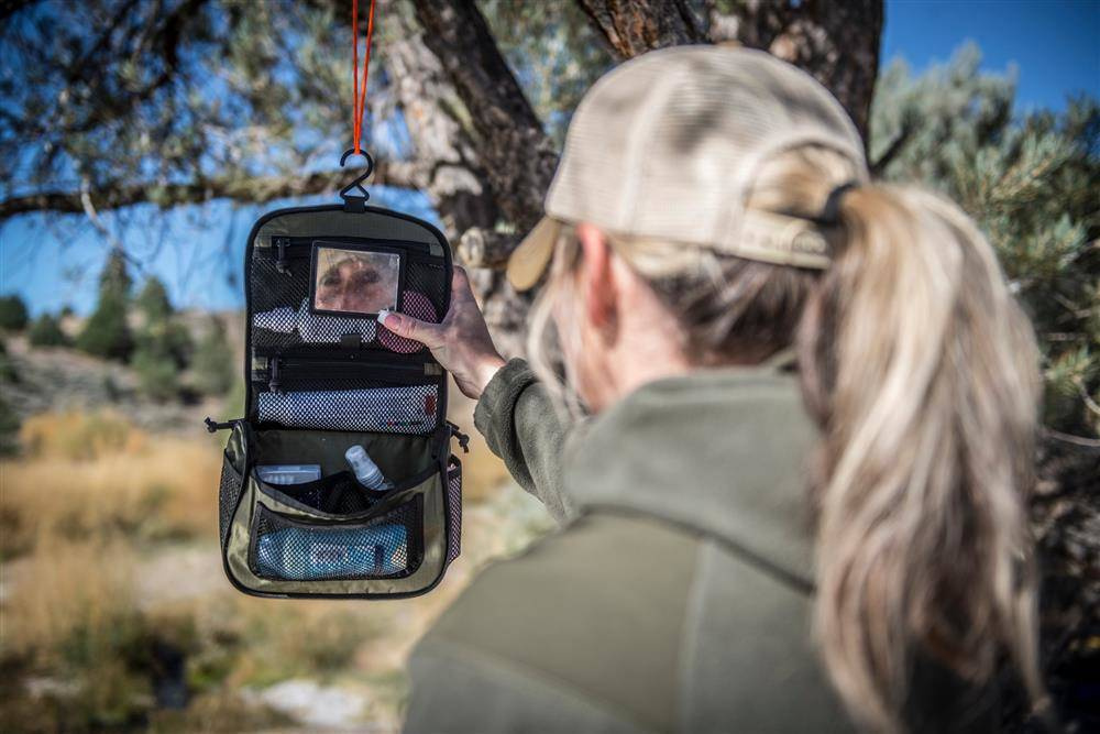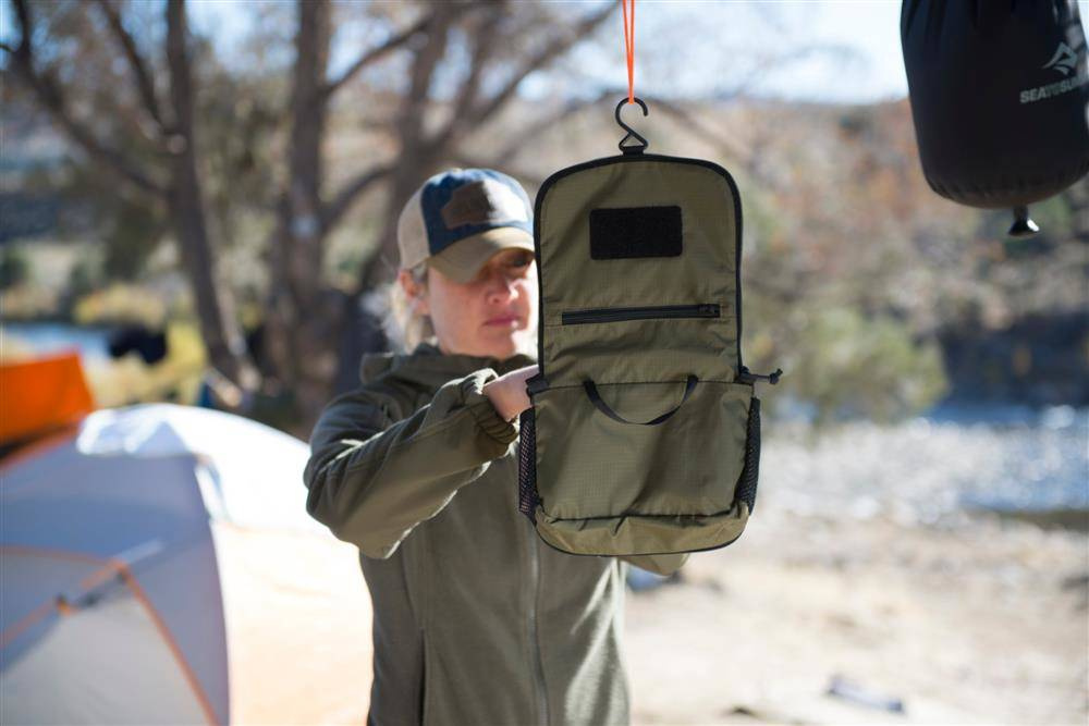 Die Tasche hat ein geräumiges Hauptfach, das sich mit einem Zwei-Wege-Reißverschluss schließen lässt. Im Inneren befinden sich Netztaschen und elastische Riemen für die Organisation von Kosmetika. Außerdem hat sie einen abnehmbaren Spiegel. Zwei Seitentaschen bieten Platz für Gegenstände wie eine Zahnbürste oder einen Rasierapparat. An der Vorderseite der Tasche befindet sich ein Klettverschluss zum Anbringen von Aufnähern oder Abzeichen.