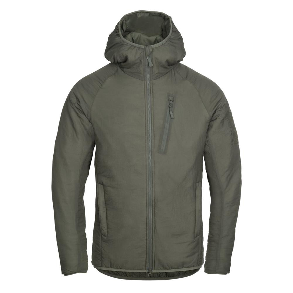 Die leichte Wolfhound Hoodie Isolierjacke von Helikon. Geschaffen für das tägliche Tragen bei kaltem Wetter, sowie für den Einsatz bei langen Wanderungen im Wald als Oberbekleidung oder wärmende Schicht unter einer Softshell- oder Regenjacke. Sie hat eine verstellbare Kapuze, die den Kopf vor Wind und Kälte schützt, und wenn sie nicht aufgesetzt ist, bildet sie eine Art Schornstein zum Schutz des Halses.