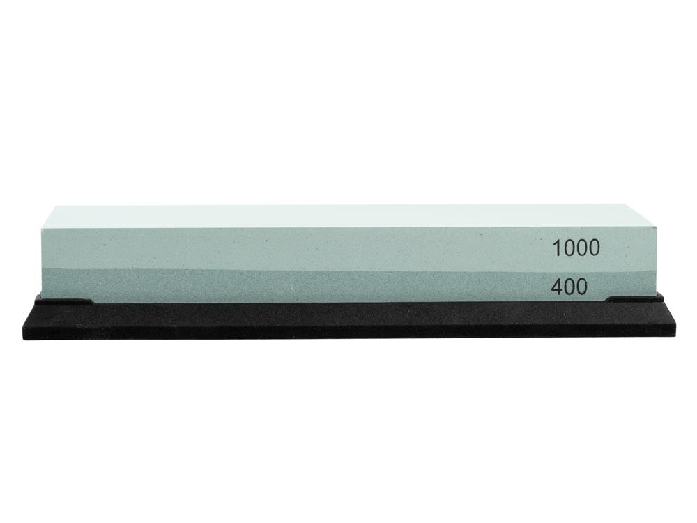Der Stein besteht aus Korund und hat eine zweifache Abstufung - mittel (400) in dunkelgrau, zum Ausbessern und Glätten von Kanten, und extra fein (1000) in hellgrau, für die richtige Schärfe. Der rutschfeste Gummifuß verhindert ein Verrutschen des Steins beim Schärfen.