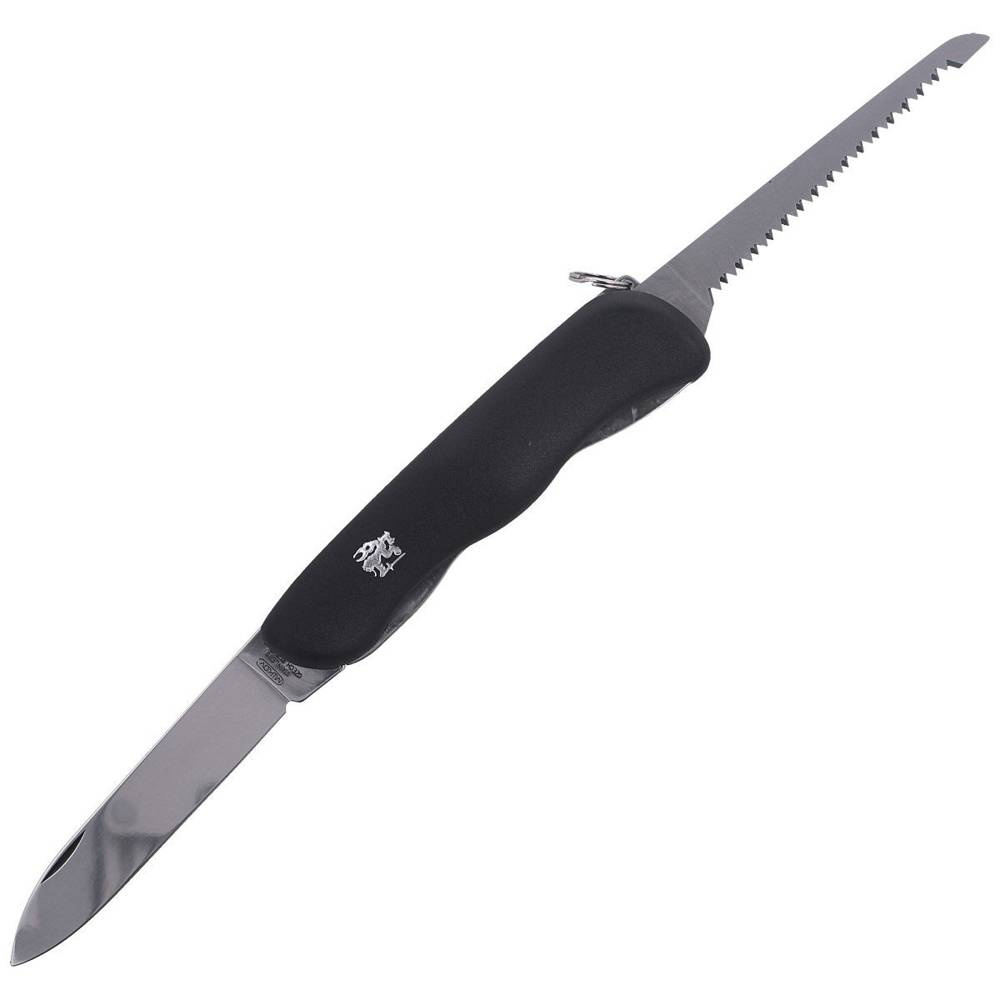 Es verfügt über zwei Klingen aus rostfreiem Stahl AISI 420, die eine lange Lebensdauer und Korrosionsbeständigkeit garantieren. Das Werkzeug besteht aus einem 70 mm langen Hauptblatt und einer Universalsäge. Beide Werkzeuge sind mit einem Liner Lock ausgestattet, der die Arbeitssicherheit erhöht und ein versehentliches Umklappen während des Gebrauchs verhindert.