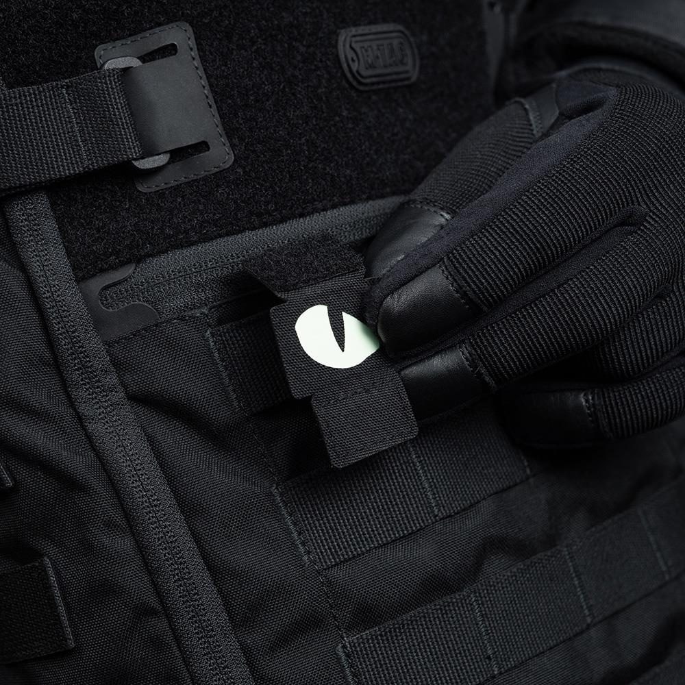 M-Tac Tiger Eyes taktische Aufnäher sind so konzipiert, dass sie an MOLLE-Bändern befestigt werden können, nicht nur am üblichen Klettverschluss. Das Bild besteht aus im Dunkeln leuchtendem fluoreszierendem Material.