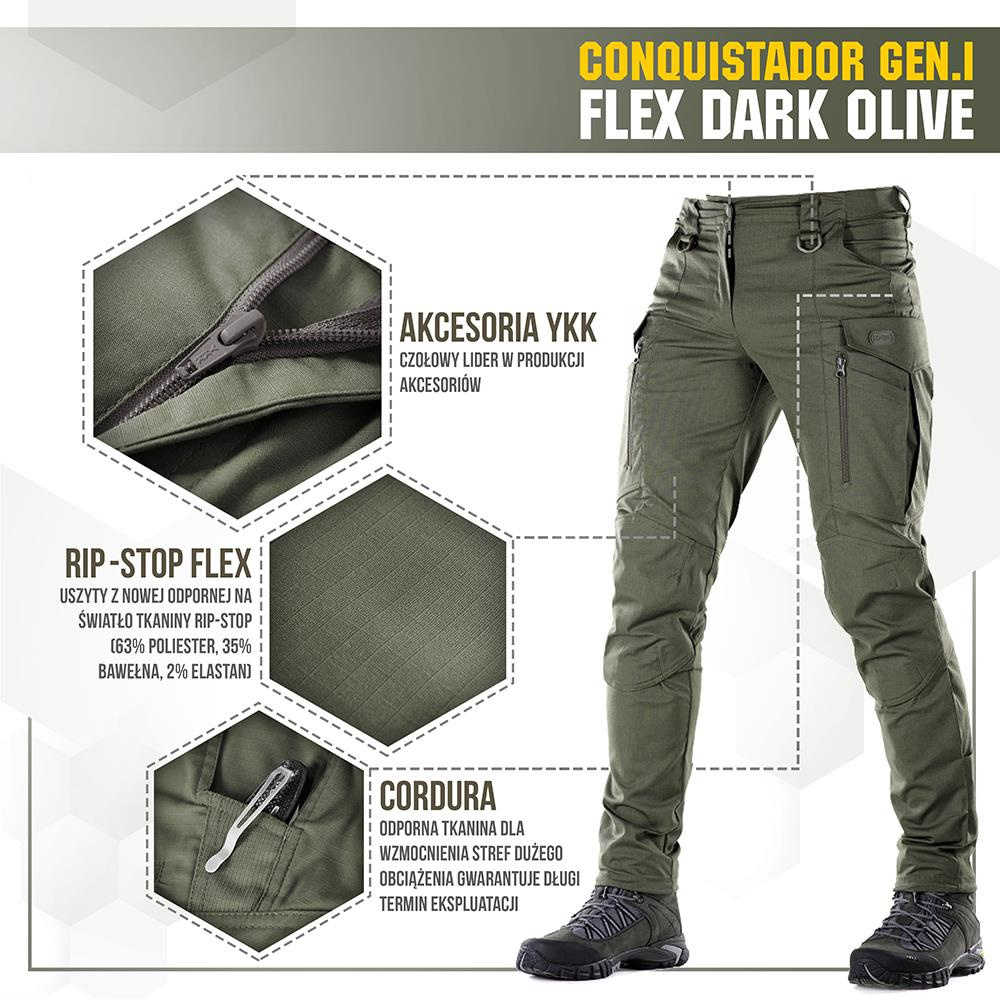 Die Militärhose Conquistador Gen.I Flex verfügt über eine Taillenlängenverstellung mit Klettverschlüssen und einen Reißverschluss von einem renommierten Unternehmen YKK. 55 mm breite Gürtelschlaufen ermöglichen die Verwendung der meisten auf dem Markt erhältlichen taktischen Gürtel. Dank der Bänder und Klettverschlüsse an den Beinen ist es möglich, diese in zwei Höhen nach den persönlichen Vorlieben des Benutzers zu verstellen.