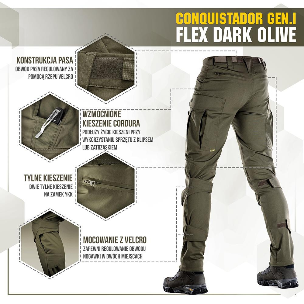 Taktische Hose Conquistador Gen.I Flex ist ein fortschrittliches Modell mit vielen Funktionen der Firma M-Tac. Flexibles und bequemes Material macht die Hose perfekt für besondere, jagdliche und touristische Aktivitäten. Durchdachte und zahlreiche Taschen in Cargohosen erleichtern das Mitführen von EDC (Every Day Carry) Ausrüstung, wie z.B. Klappmesser.