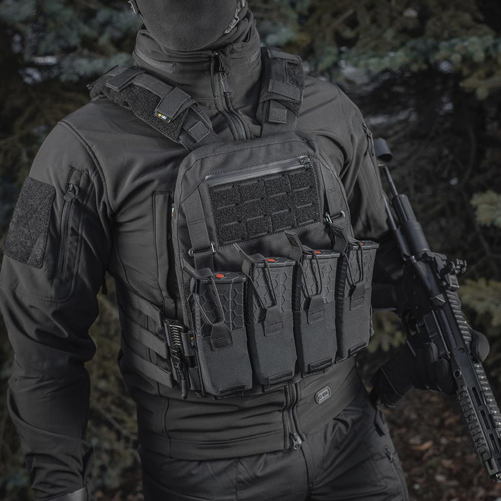 DerPlattenträger besteht aus zwei geräumigen Abschnitten, die Taschen für ESAPI Large und Extra Large ballistische Platten sind, getrimmt mit Befestigungsgurten, die die Installation von Taschen und Beutel kompatibel mit dem MOLLE / PALLS-System ermöglichen. Auf der Vorderseite befinden sich vier universelle Taschen für Magazine für Langwaffen, die durch elastische Kordeln vor dem Herausfallen geschützt sind.