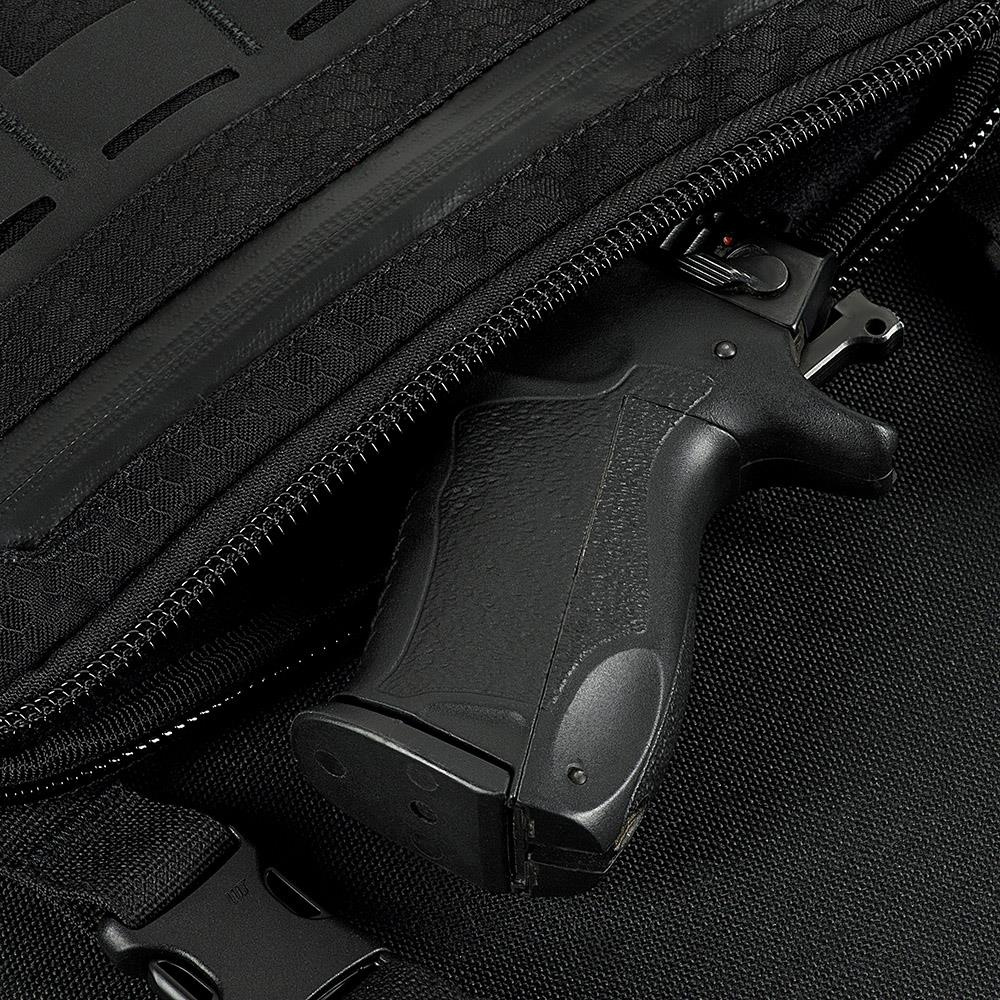 Die Reißverschlusskante der Vordertasche wurde in ein hydrophobes Material eingefräst, das das Eindringen von Wasser in die Tasche reduziert. Außerdem befindet sich auf der Vorderseite ein MOLLE/PALS-Panel, an das weitere Universaltaschen angeschlossen werden können, was die Gesamtfunktionalität der Tasche erhöht. Auf der Netzrückseite befindet sich eine spezielle Tasche für ein Smartphone oder einen Gegenstand ähnlicher Größe.