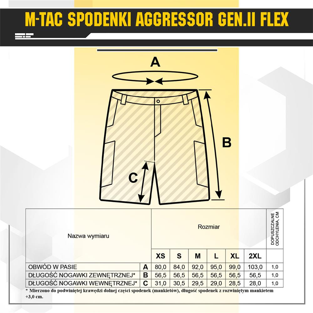 Aggressor Gen.II Flex taktische Shorts aus weichem Material sind eine längere Version der Aggressor Shorts, die für jede Gelegenheit im Sommer geeignet sind. Hergestellt von der Firma M-Tac. Zahlreiche Taschen ermöglichen den bequemen Transport der notwendigen Grundausstattung, Telefon, Portemonnaie oder Schlüssel. Die Verwendung eines speziellen Rip-Stop-Flex-Gewebes schützt das Material der Hose vor Abrieb bei intensivem Einsatz im Wald oder bei taktischen Aufgaben. Der Schnitt der Hose eignet sich sowohl für den täglichen Gebrauch als auch für die Erholung im Freien.