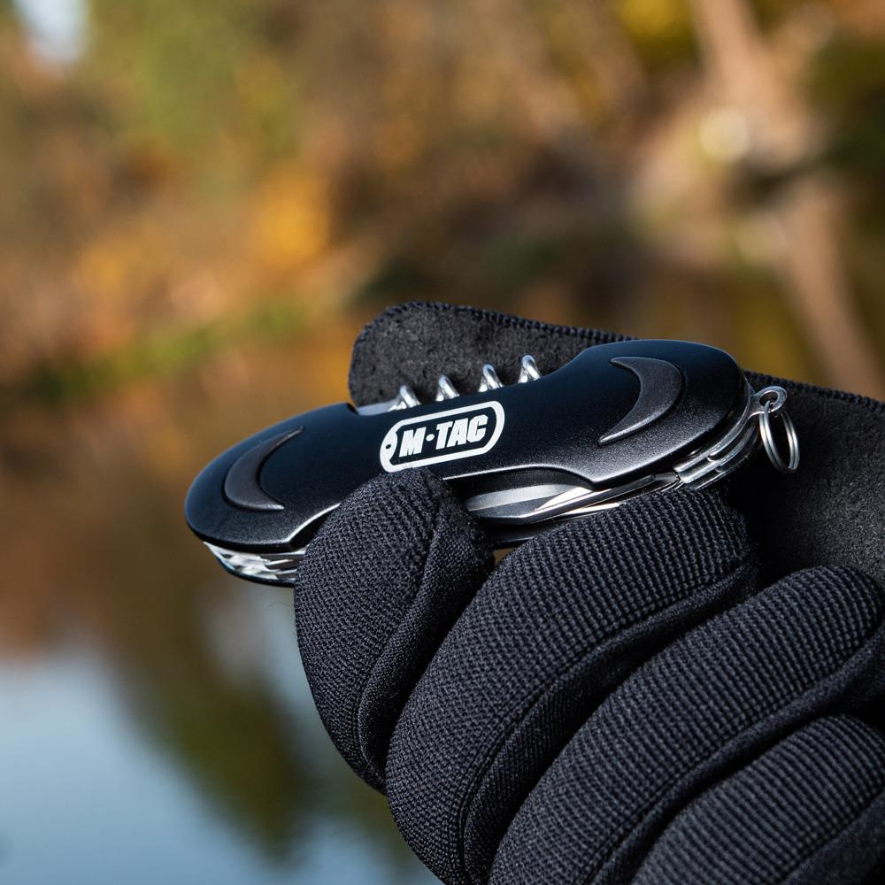 Ein kleines Taschenmesser von M-Tac. Es bietet einfachen Zugriff auf viele nützliche Werkzeuge, was bedeutet, dass seine Funktionalität effektiv mit bekannten Marken konkurriert, die auf die Herstellung von Taschenmessern spezialisiert sind.