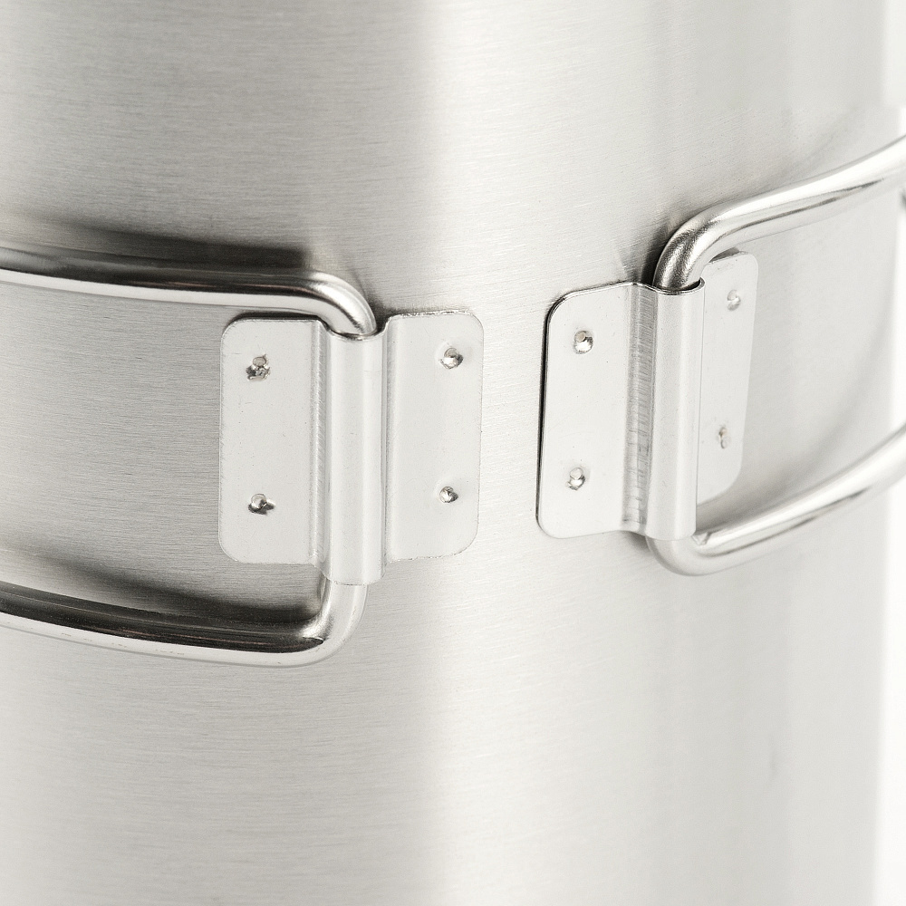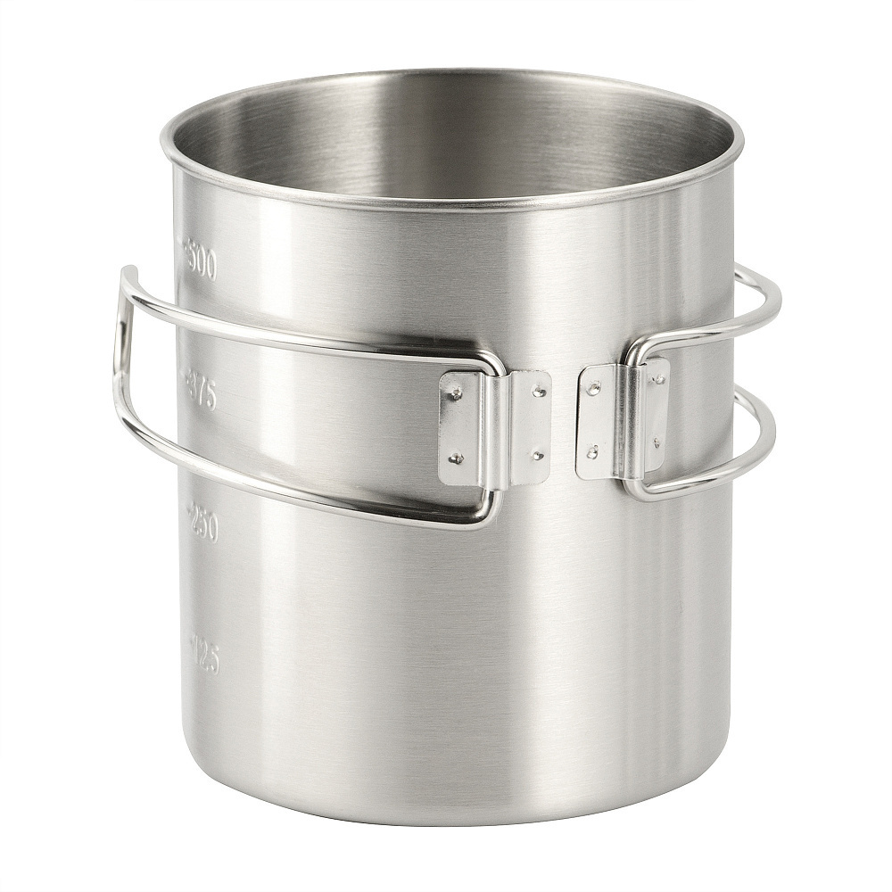 Aus Edelstahl sorgt für eine hohe Haltbarkeit und Beständigkeit gegen ungünstige Witterungsbedingungen oder längeren Kontakt mit Feuchtigkeit. Klappgriff verhindert Verbrennungen und hilft, den Becher bequem in den Rucksack zu packen, wodurch Platz für Gepäck gespart wird