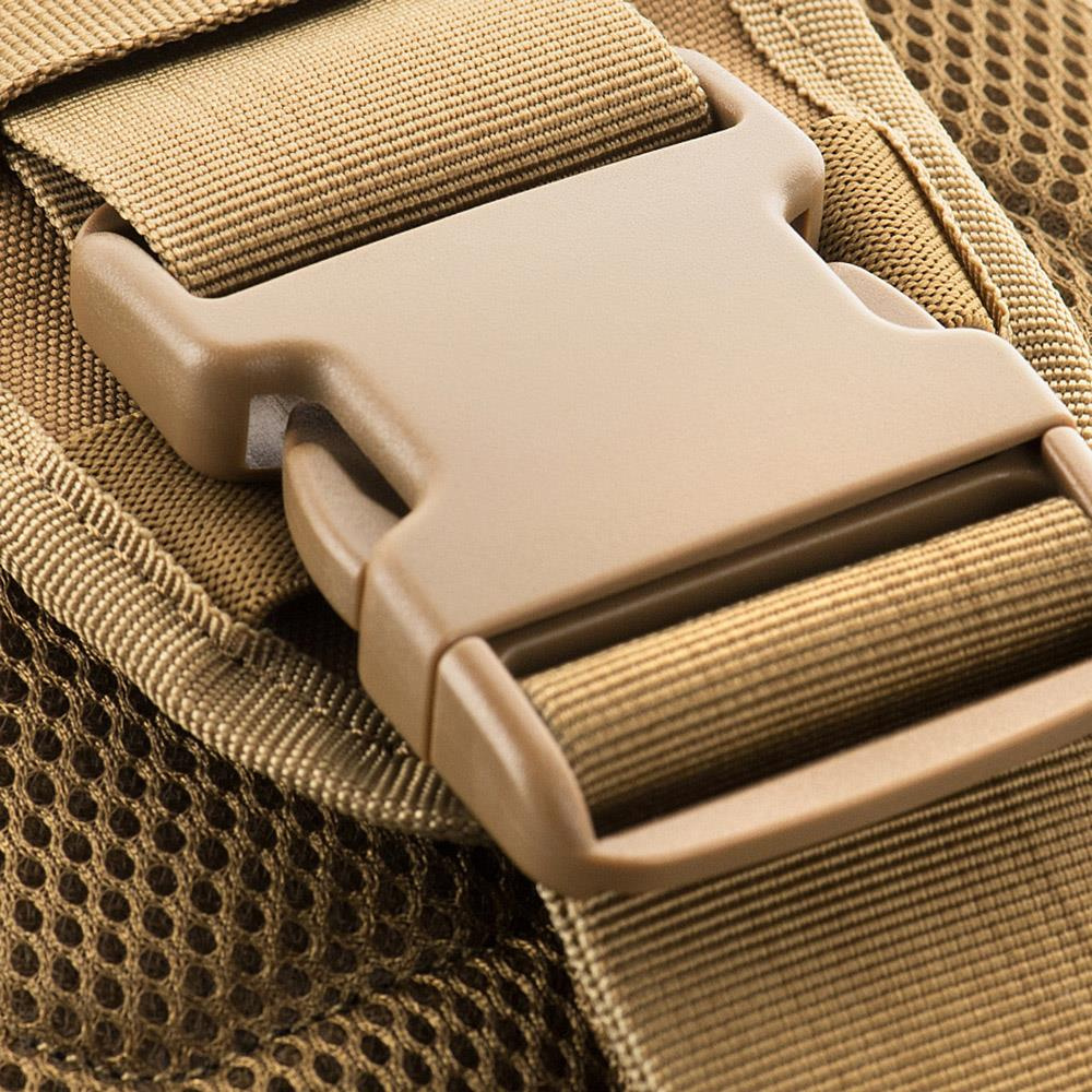 An der Tasche ist ein verstellbarer Riemen angebracht, der über der Schulter getragen werden kann und schnell und einfach an der anderen Seite befestigt werden kann. Sowohl am Tragegurt als auch am Rucksack selbst befinden sich MOLLE-Befestigungsgurte, die das Anbringen zusätzlicher Pouches oder Taschen ermöglichen.