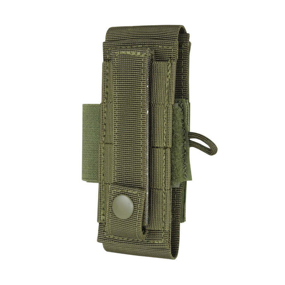 Sie hat eine verstellbare Klappe, die mit Klettverschluss befestigt wird, die ein Herausrutschen des Gases verhindert. Die Hülle kann horizontal oder vertikal an MOLLE-Befestigungsgurten für einen taktischen Rucksack, Kampfgürtel oder eine taktische Weste befestigt werden. Es kann auch verwendet werden, um ein Klappmesser, eine LED-Taschenlampe, Pfefferspray oder andere Ausrüstung zu tragen.