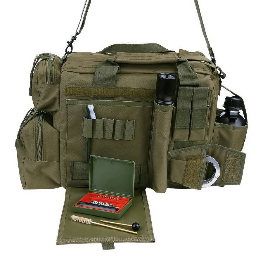 Auf einer Seite der Tasche befinden sich zwei Taschen, die mit Zwei-Wege-Reißverschlüssen geschlossen werden. Auf der gegenüberliegenden Seite befindet sich ein Fach, das mit einem Klettband gesichert ist. Das Fach hat eine innere Trennwand, die die mitgeführte Ausrüstung trennen kann.