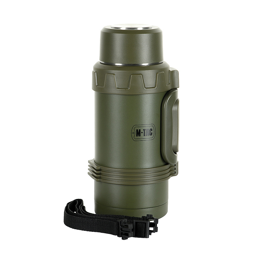 Touristische Thermoskanne im Military-Look von M-Tac. Praktische Lösungen wie der klappbare Griff und der abnehmbare Gurt ermöglichen einen bequemen Transport der Thermoskanne mit großem Fassungsvermögen, sei es bei einem Picknick, einer Trekkingtour oder bei anspruchsvollen Patrouillen von Uniformierten.