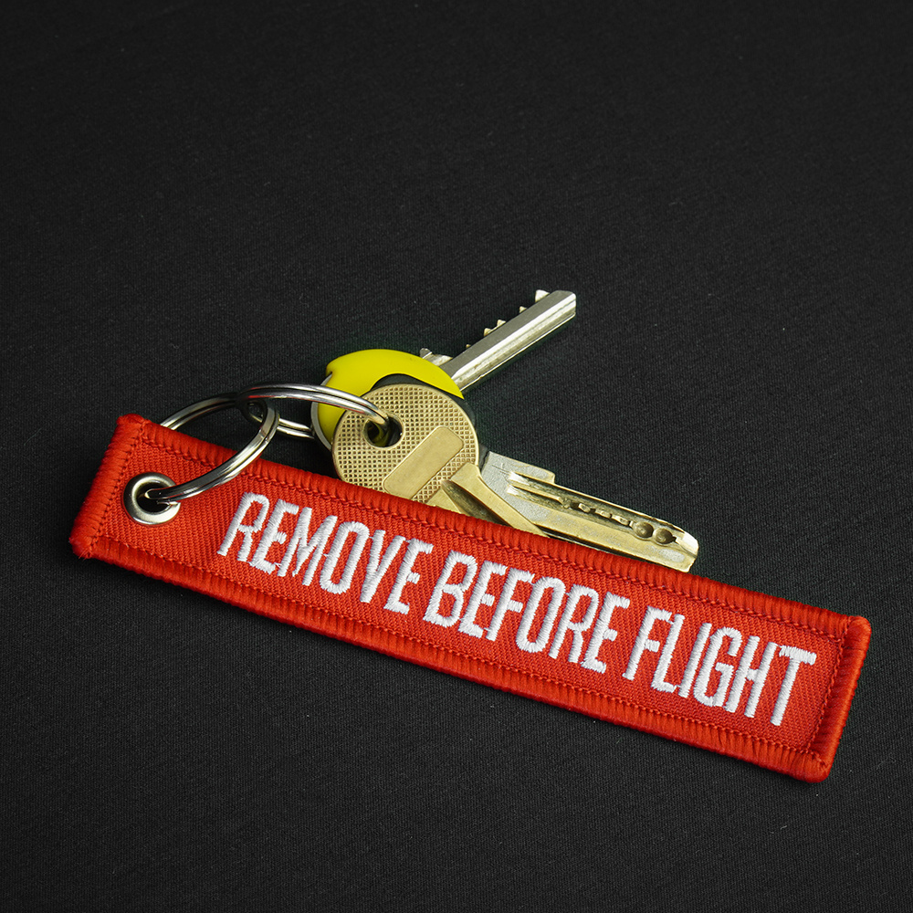 Ein dekorativer Schlüsselanhänger für Ausrüstung mit der Aufschrift Remove Before Flight von Mil-Tec. An den Schlüsseln eines Motorrads, Rucksacks oder einer Jacke befestigt, verleiht es einen militärischen Look. Dies ist eine Miniaturversion der echten Zeichen, die in der Luftfahrt verwendet werden. Sie sind bei stehender Maschine an auswechselbaren Teilen des Flugzeugs angebracht und müssen vor dem Start entfernt werden.