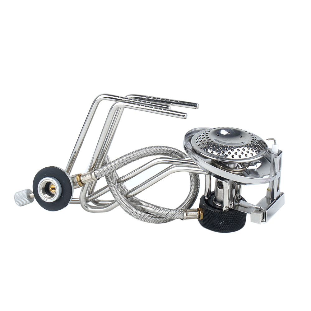 Der klappbare Touristenbrenner 14911100 ist mit einem flexiblen Schlauch mit EN417-Anschluss ausgestattet. Er ermöglicht den seitlichen Anschluss der Gaskartusche, so dass der Brenner stabil direkt auf dem Boden stehen kann.