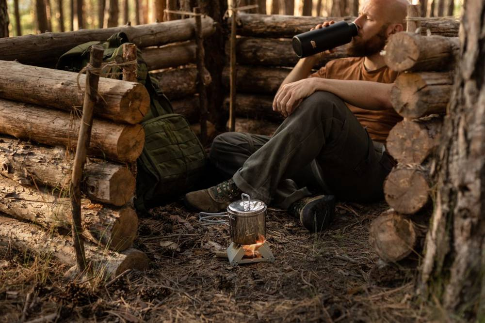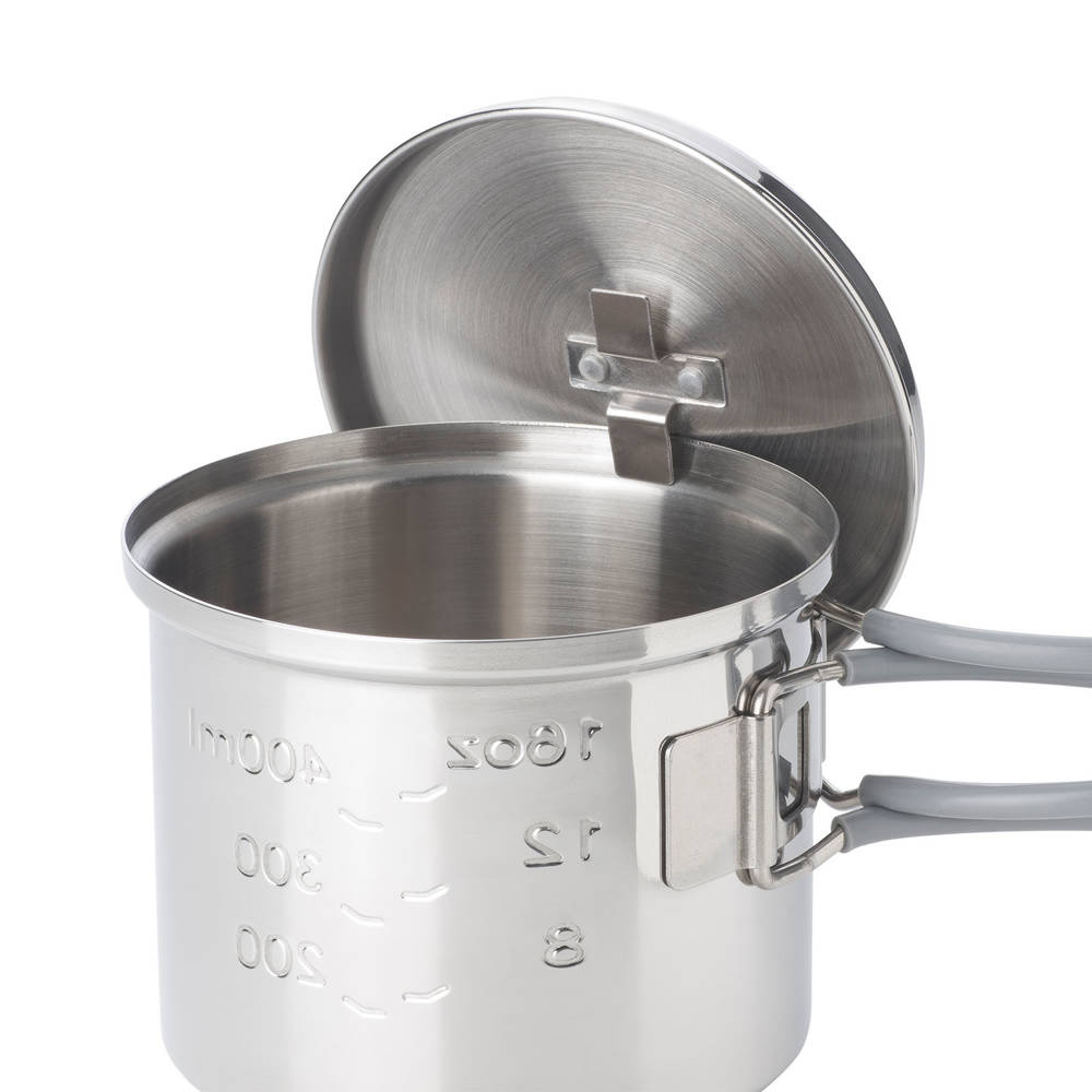 Der Touristentopf ist aus hochwertigem Edelstahl gefertigt, was ihn widerstandsfähig gegen hohe Temperaturen macht. Der Topf hat einen integrierten Griff, der zum Transport heruntergeklappt werden kann. An der Außenseite des Gefäßes befindet sich eine Kapazitätsskala in ml und oz.