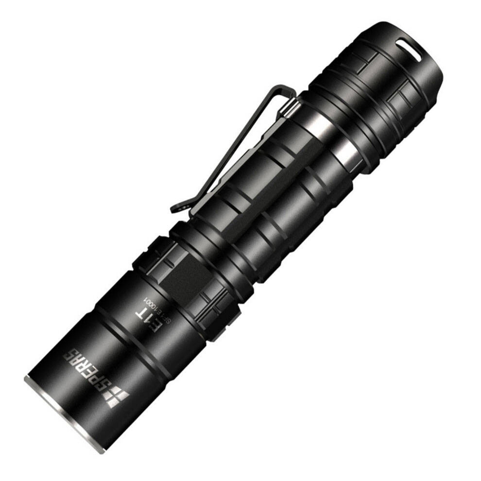 Speras E1T ist eine kompakte Handtaschenlampe mit einer Leistung von 1700 lm. Die Luminus SST40-Diode sorgt für einen starken Lichtstrahl mit einer Reichweite von bis zu 284 m. Die Taschenlampe verfügt über zwei Betriebsarten, darunter Stroboskop. Es kann mit einem austauschbaren 18650-Akku mit einer Kapazität von 2600 mAh oder zwei CR123A-Batterien betrieben werden. Perfekt für EDC.