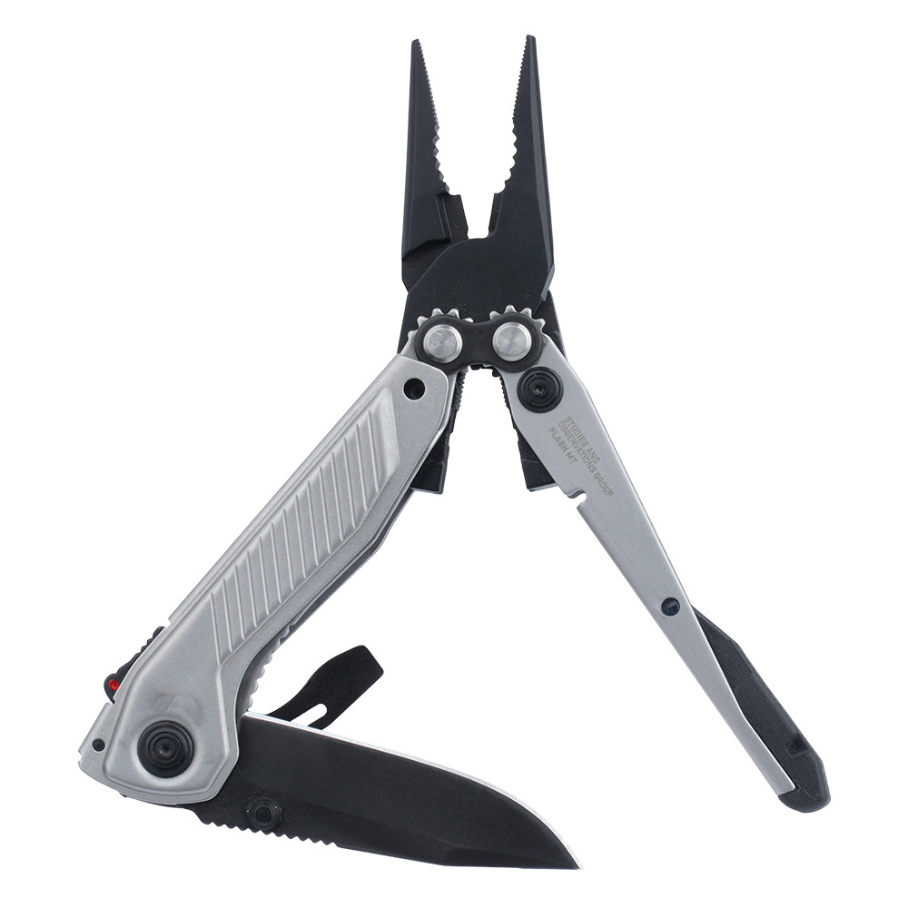 Multitool ist mit 7 alltagstauglichen Werkzeugen ausgestattet, wie z. B. einem Messer, einer Zange oder einem Flaschenöffner. Außerdem verfügt er über eine Spitze zum Eindrehen von Schrauben, die in Einbaulage durch den Druck der Werkzeugarme und des Magneten gesichert werden.