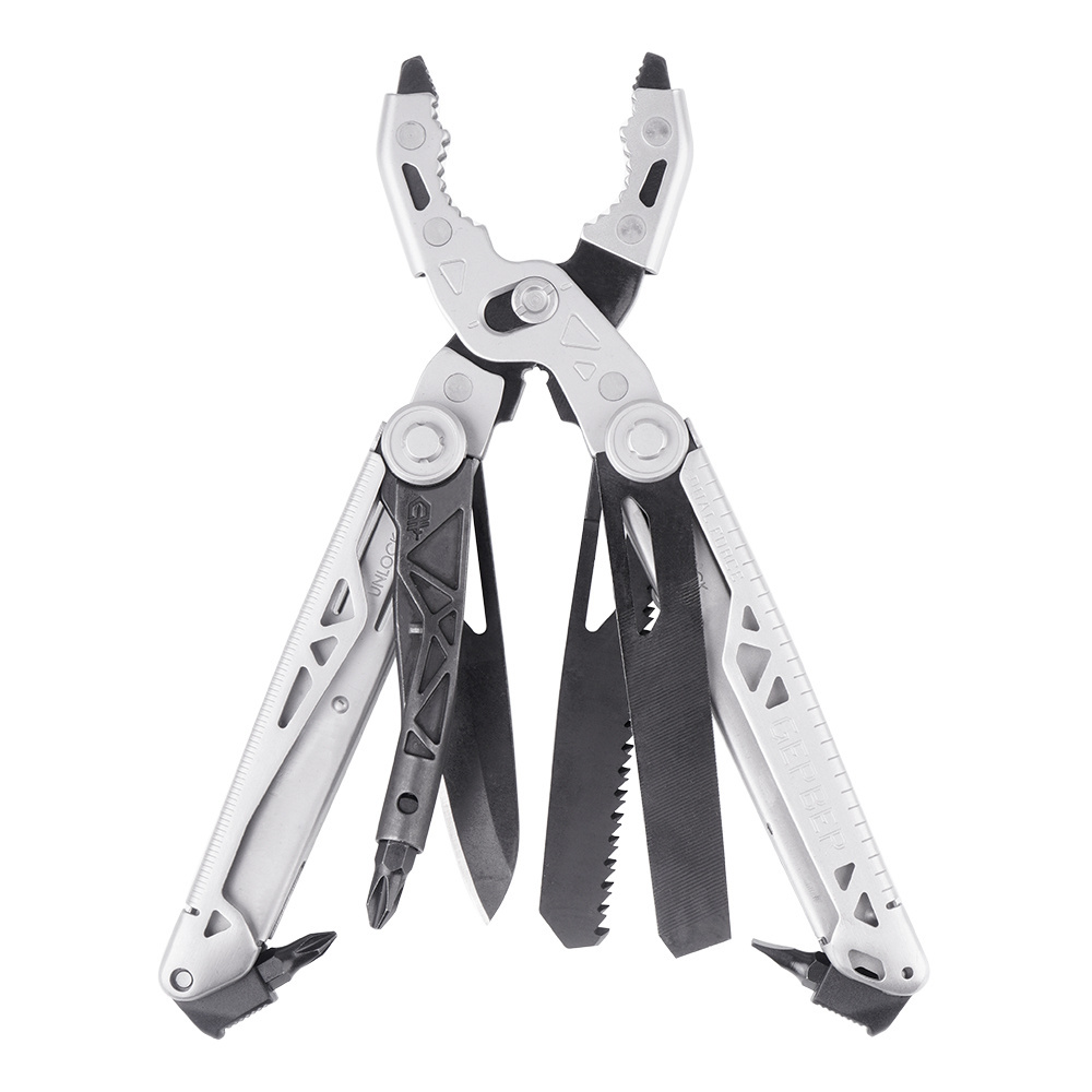 • Multitool aus Edelstahl, ausgestattet mit 12 Werkzeugen, inklusive Zange mit in zwei Positionen verstellbaren Backen. Im Vergleich zu anderen Multifunktionswerkzeugen verfügt dieses Modell über einen zentral angeordneten Center-Axis-Schraubendreher.