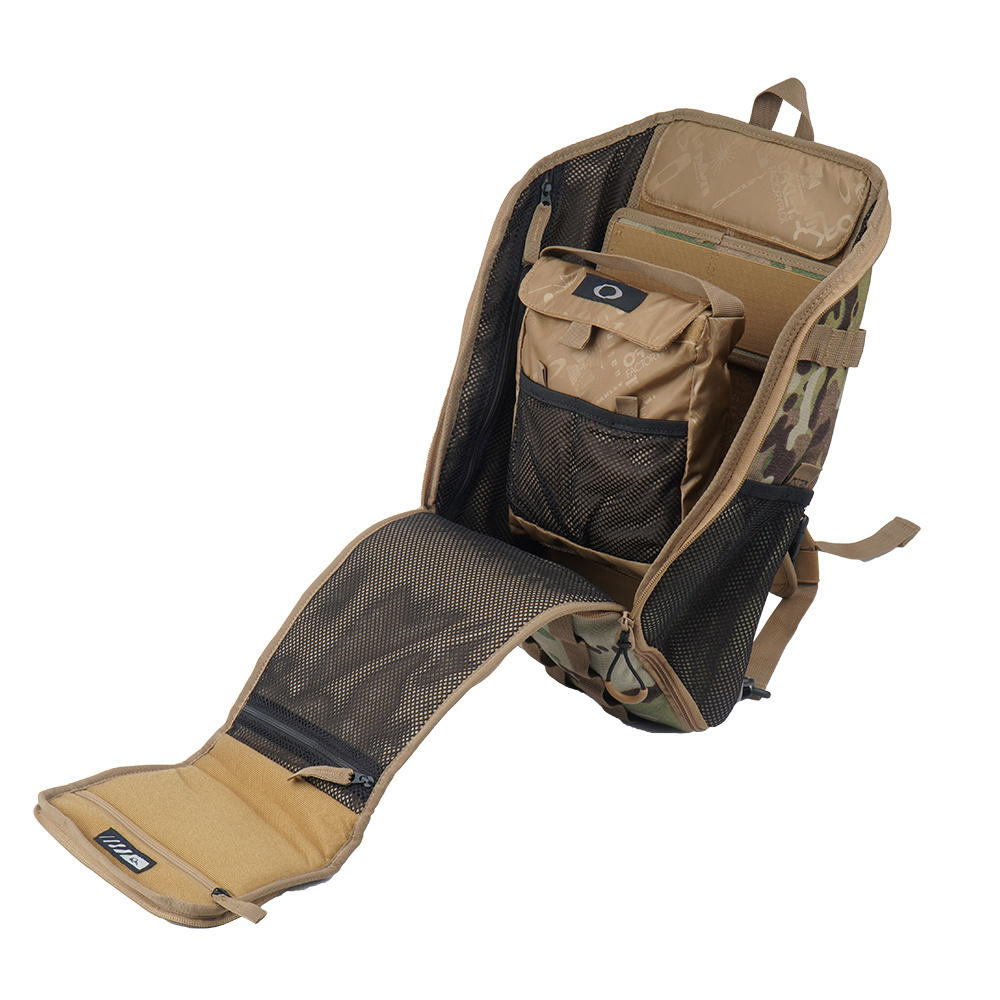 Die Frontplatte ist mit einer im Lasercut-Verfahren hergestellten Klettplatte ausgestattet, die es ermöglicht, die Riemen des Molle-Systems hindurch zu verweben. Dies ermöglicht ein einfaches Anbringen von Taschen, Taschenlampen, Patches oder anderem Zubehör. Strapazierfähige MOLLE-Gurte sind auch an den Seiten und am Boden der Tasche angebracht.