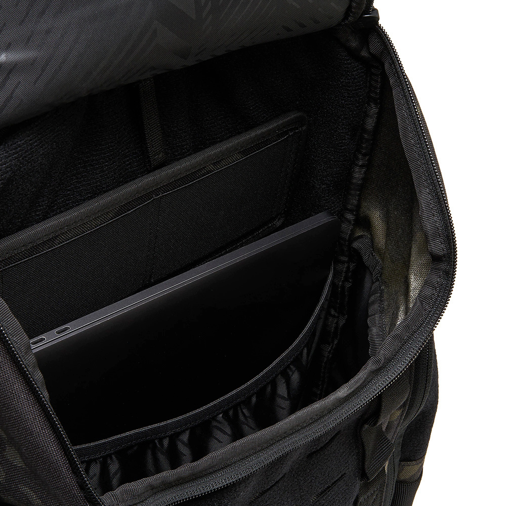 Die Frontplatte ist mit einer Klett-Lasercut-Platte ausgestattet, die es ermöglicht, die MOLLE-Systemgurte hindurchzufädeln. Dies ermöglicht ein einfaches Anbringen von Taschen, Taschenlampen, Patches oder anderem Zubehör. MOLLE-Straps sind auch auf der Vorderseite angebracht, wo sie als Transportgriffe dienen, und an den Seiten des Rucksacks.