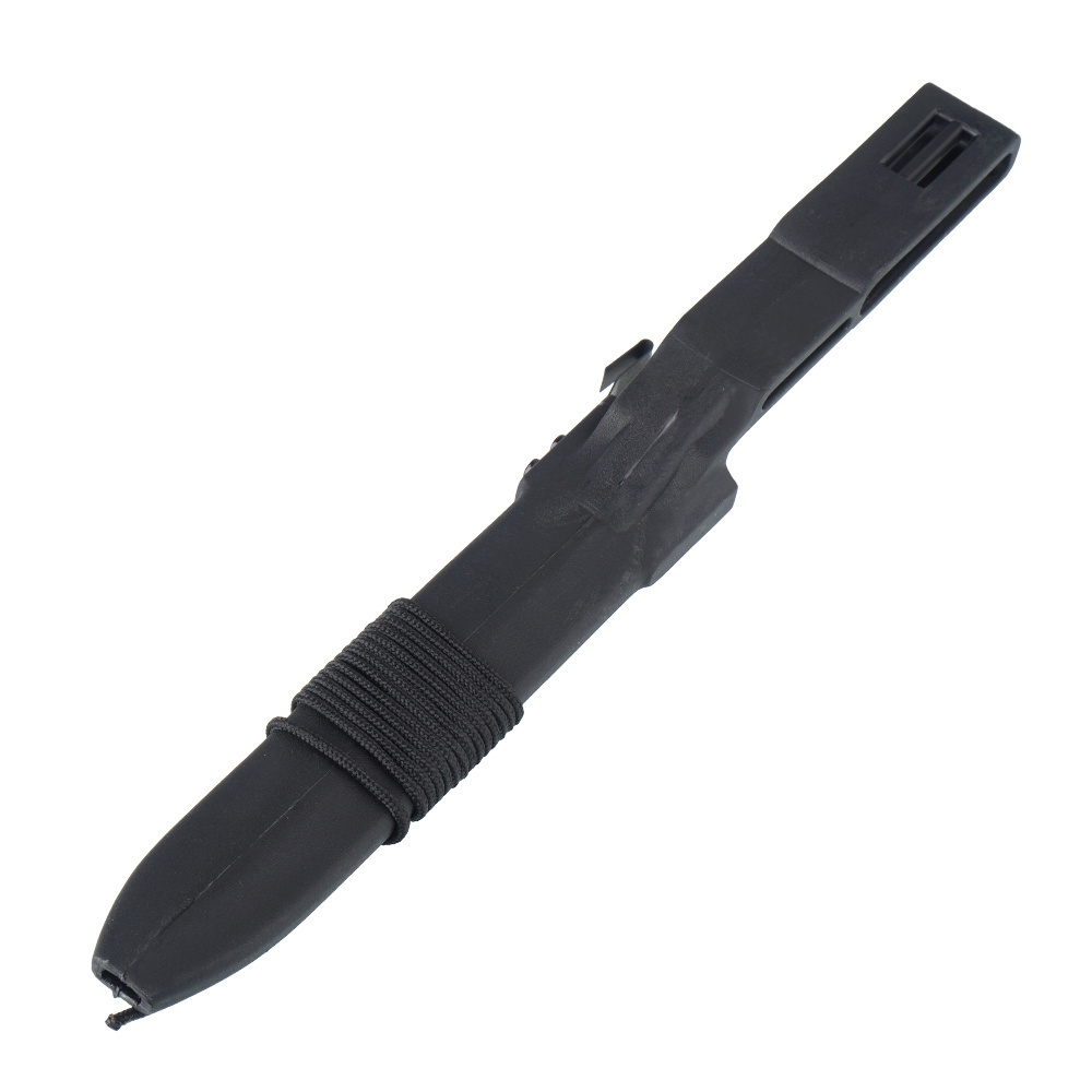 • Scheide für wz. 98 Messer. Hergestellt aus strapazierfähigem Polymer, ausgestattet mit Löchern für Gürtel verschiedener Breiten und Paracords, einem Federverschluss und einem Nylonseil. Schwarze Farbe.