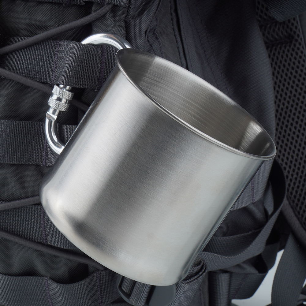 Edelstahlbecher hergestellt von M-Tac. Er hat einen faltbaren Griff in Form eines Karabiners, dank dem Sie die Tasse an Ihrer Ausrüstung befestigt tragen können. Perfekt für einen Ausflug in die Berge, für einen Survival-Trip oder beim Camping.