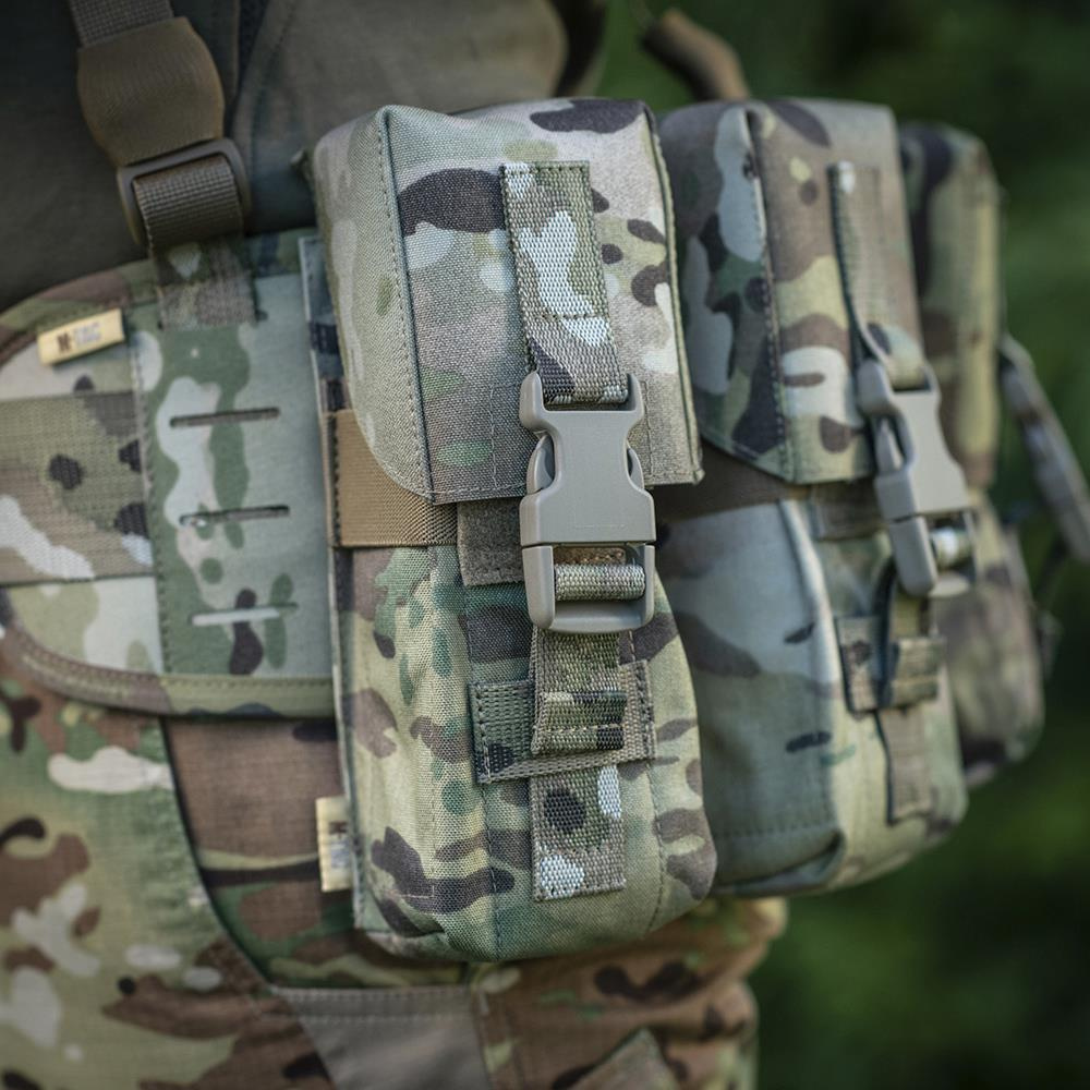 Geschlossene Tragetasche für zwei Magazine für Gewehre der AR/AK-Plattform für M-Tac. Zusätzlich zu zwei Magazinen kann sie einen Gegenstand oder eine Ausrüstung von ähnlicher Größe aufnehmen, wie z. B. ein Funkgerät. Die in der Tasche untergebrachten Gegenstände werden durch ein elastisches Band in Kragenhöhe stabilisiert, das ein übermäßiges Anstoßen des Inhalts und Vibrationen verhindert.