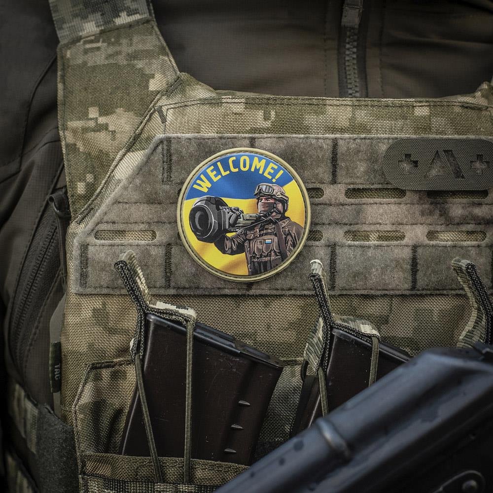 - Das Motiv des Soldaten mit NLAW-Werfer auf dem Hintergrund der ukrainischen Flagge und die Aufschrift "Welcome" sollen die Moral der Truppen steigern und sie zum Kampf ermutigen.