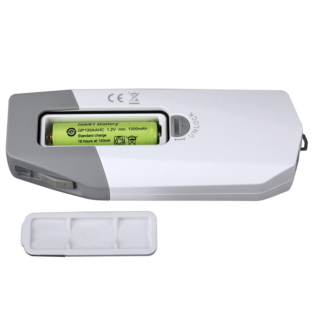 • Stromversorgung auf drei Arten möglich: mit Akku oder AA-Batterie (1x) oder manuell