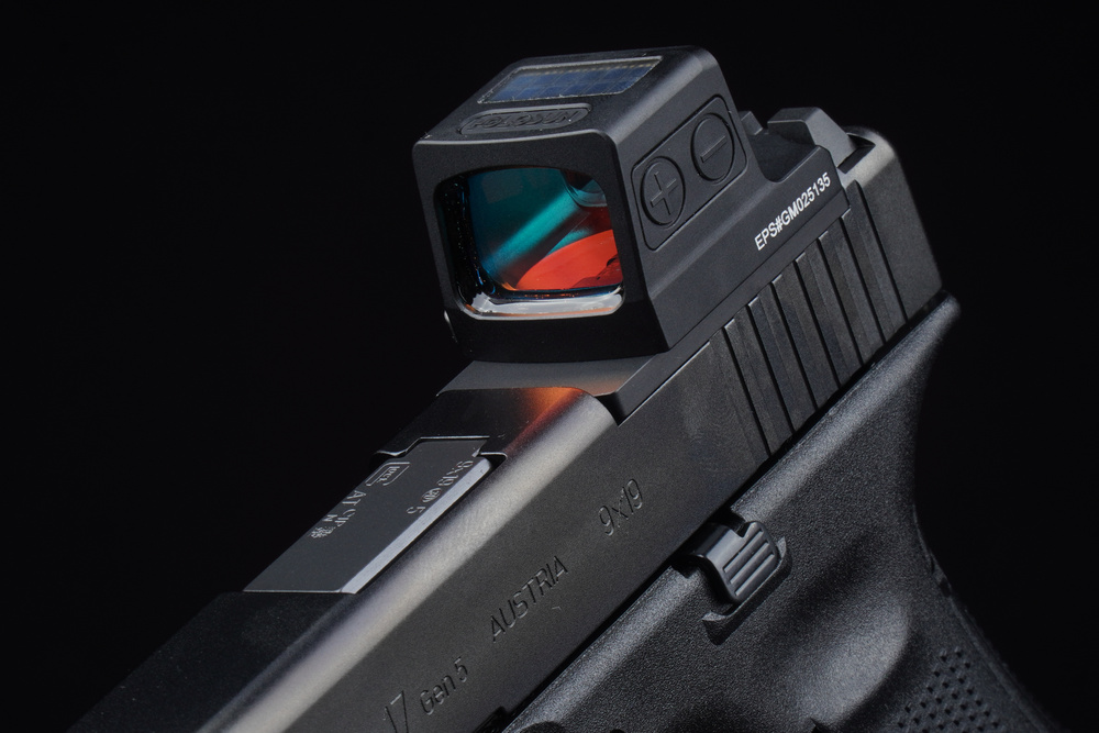 Ein kompaktes, geschlossenes und flaches Rotpunktvisier mit einem Visierabsehen mit 3 Markierungen und 12 Leuchtstufen, einer Hybrid-Stromversorgung mit Batterie und Solarzelle und einem robusten Aluminiumgehäuse.