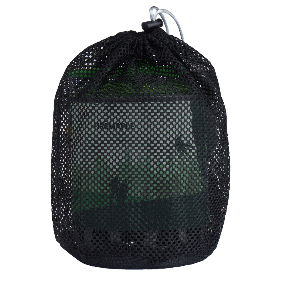 Das ganze Set passt in den Topf, sodass es nicht viel Platz einnimmt in Trekkingrucksack. Im Set enthalten ist ein Netzbeutel mit Kordelzug, der den Transport des Topfes vereinfacht.