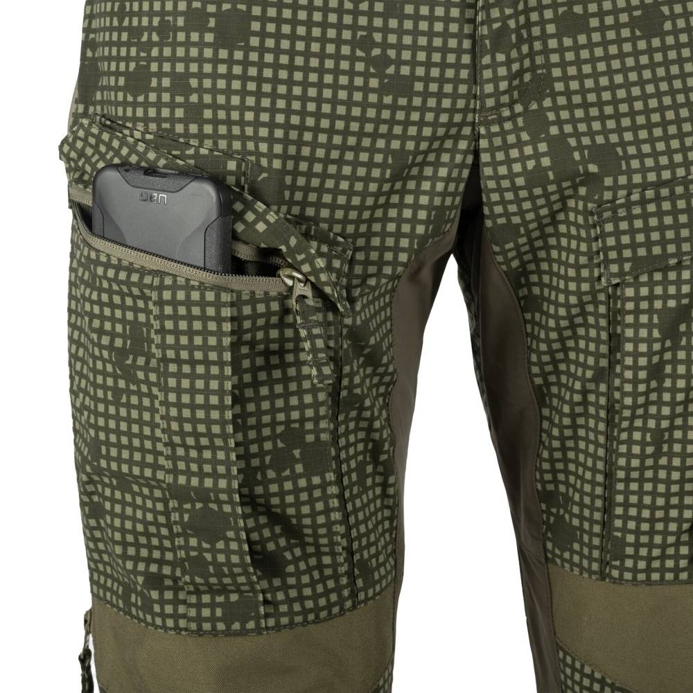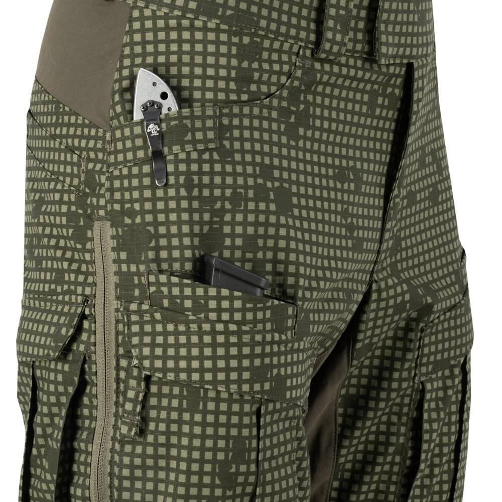 Das verwendete Grundmaterial ist Polycotton Stretch Ripstop in verschiedenen Tarnfarben. Die Verwendung dieses Materials sorgt für außergewöhnliche Haltbarkeit, Luftdurchlässigkeit und schnelles Trocknen im Vergleich zu 100% Baumwolle. Alle wichtigen Bewegungsbereiche wie Kniebeugen, Schritt, Taille haben Einsätze aus dehnbarem und atmungsaktivem Versastrech-Material erhalten. Zusätzlich wurde der Kniebereich mit Einsätzen aus 500D Cordura verstärkt, und es wurden dort Taschen für Schutzeinlagen eingebaut. Alle Reißverschlüsse hingegen sind die bekannten und geschätzten YKK.