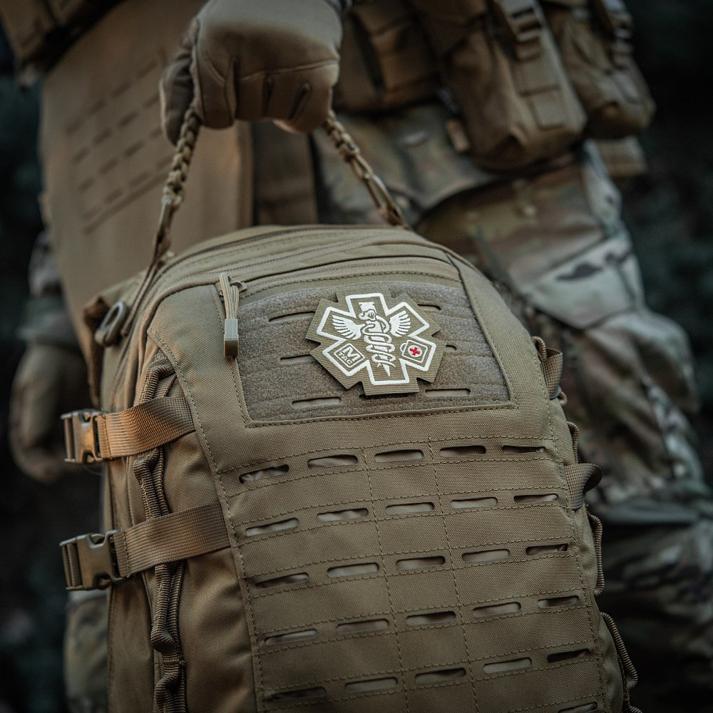 • Gesticktes medizinisches Abzeichen aus 500D Cordura. Wird mit Klettverschluss an der Ausrüstung befestigt. Farbe: Kojote.