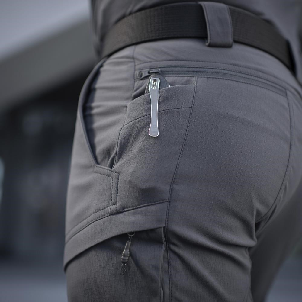 Gleichmäßig verteilte Taschen ermöglichen eine gleichmäßige Verteilung der Ausrüstung. Klassische Taschen haben verstärkte Kanten, perfekt zum Anbringen des Clips LED-Taschenlampe. Die Gesäßtaschen mit Reißverschlüssen eignen sich zum freien Tragen eines Portemonnaies. Neben den Gesäßtaschen hat der Hersteller kleine Taschen zum Tragen eines Messers oder anderer Accessoires und darunter geräumige Ladetaschen mit Reißverschluss platziert.